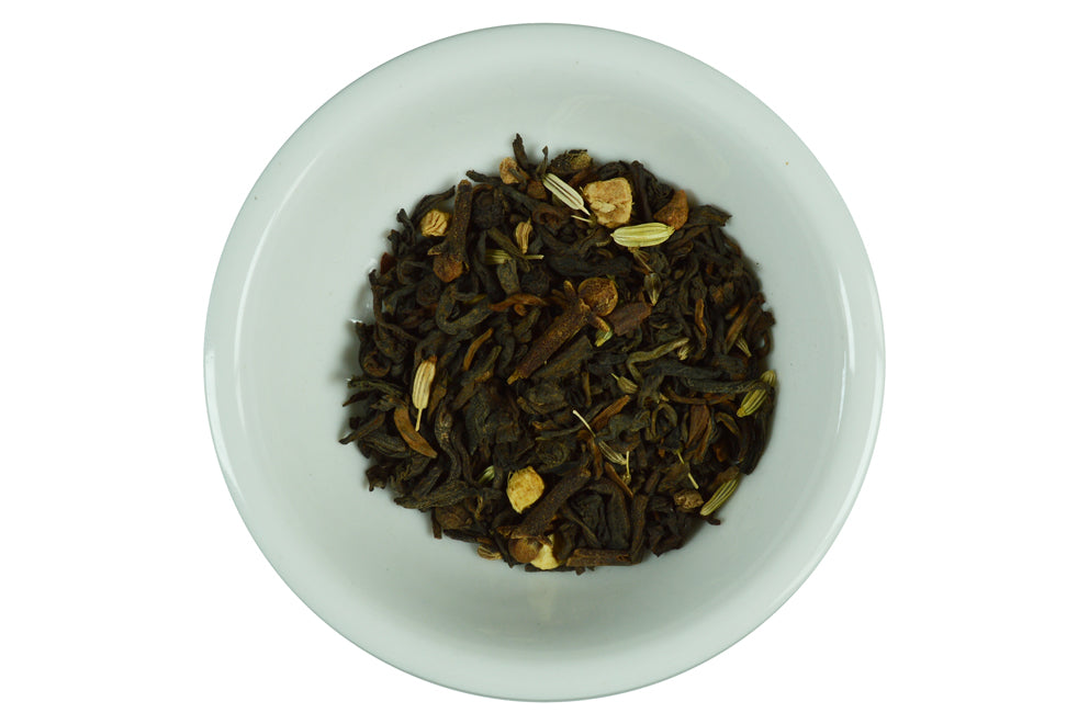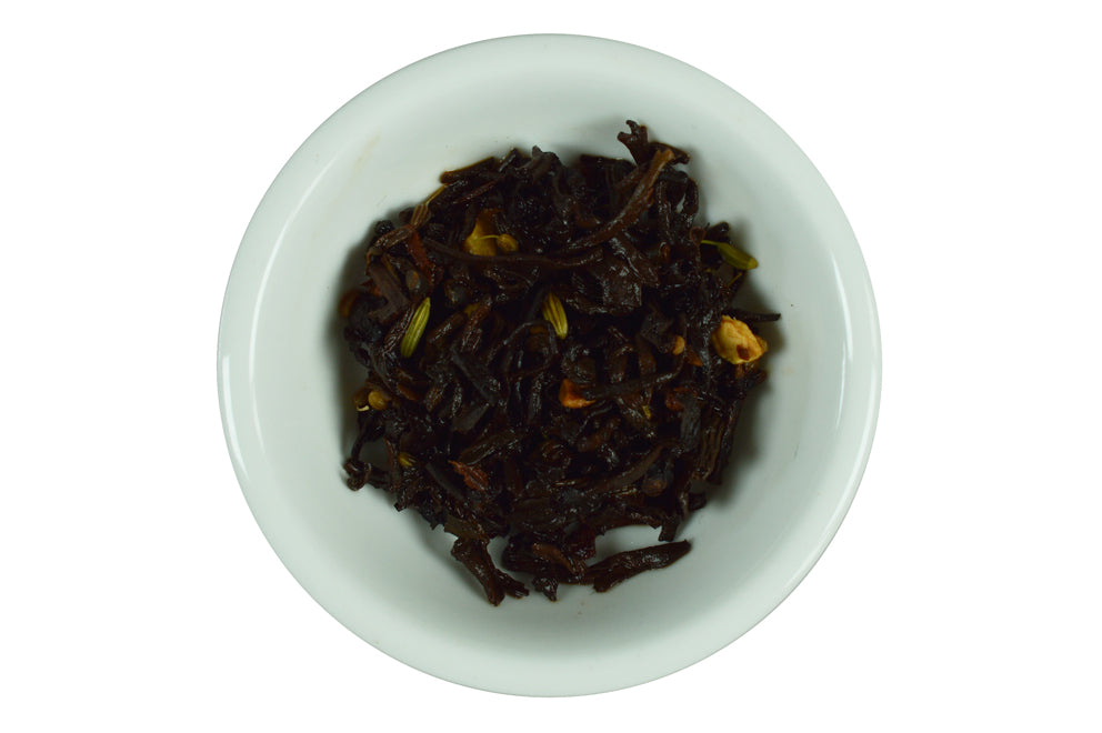 This tea is for Pu Erh beginners. We mix a strong spicy chai flavour with Pu Erh tea. The resulting Pu Erh Chai tea combination works wonderfully if pure Pu Erh is too strong for you. A strong spicy but not astringent brew. Low in caffeine, it is suitable for any time of the day.